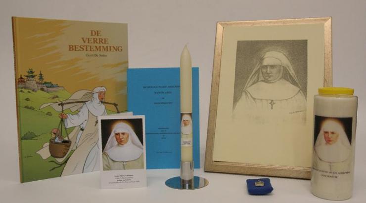 Het stripboek “De Verre Bestemming”, medailles en kaarsen met daarop de afbeelding van Zr. Marie Adolphine, pentekeningen van Zr. Marie Adolphine, een boekje over Zr. Marie Adolphine, bidprentje met daarop een foto van Zr. Marie Adolphine en haar gebed.